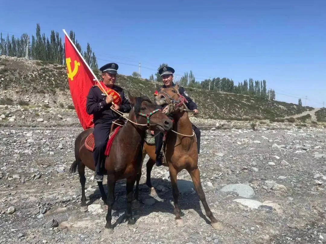在帕米尔高原,一面旗帜、一匹马、一个警务背包、一个馕,是克孜勒苏柯尔克孜自治州乌恰县公安局波斯坦铁列克派出所马热加尼库木村警务室警长加库普瓦力·拜克尧力的工作必备。