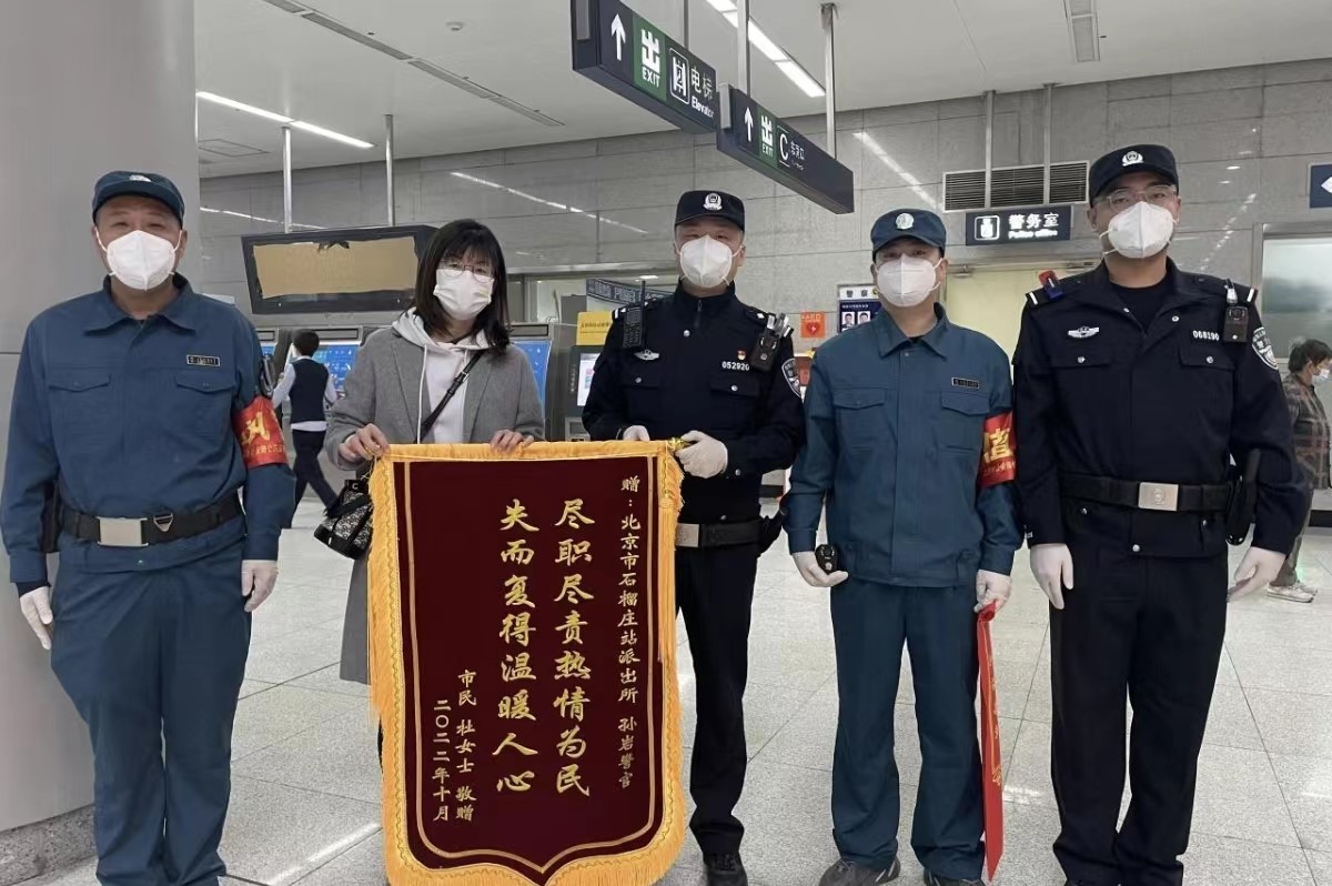 11月1日,市民杜女士执意携带一面锦旗来到地铁丰台火车站,对北京公交总队民警帮自己找回耳机表示感谢。