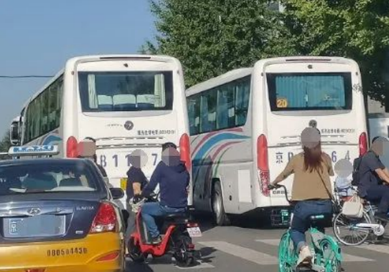 9月8日,有网友反映在人大附小银燕校区附近,两辆大客车占用行车道和非机动车道违停。