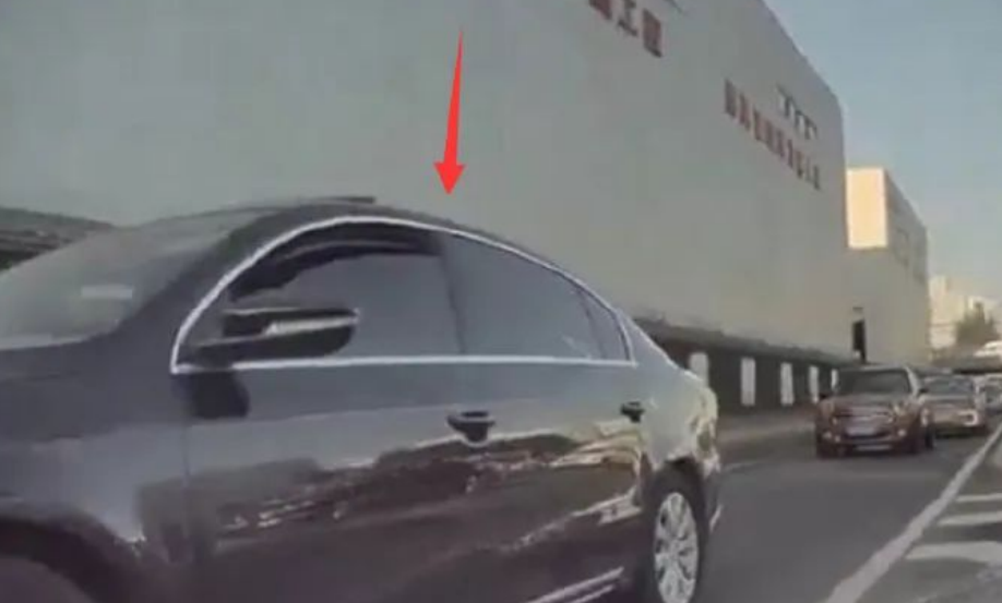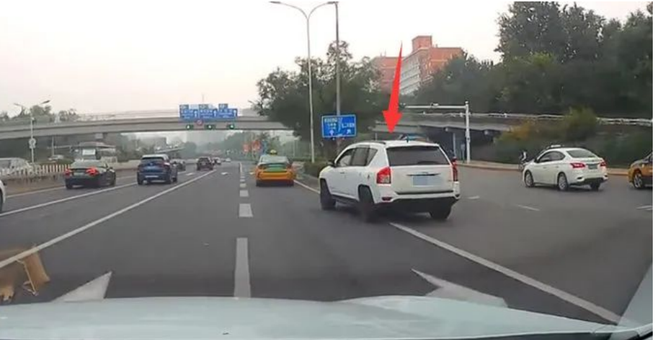 9月14日,有网友反映在东直门桥北上机场高速入口附近,一车辆轧实线并线。