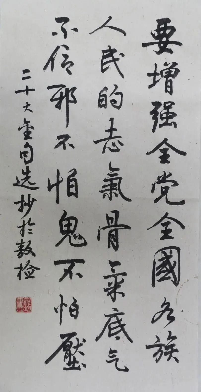 释文:要增强全党全国各族人民的志气、骨气、底气,不信邪、不怕鬼、不怕压。