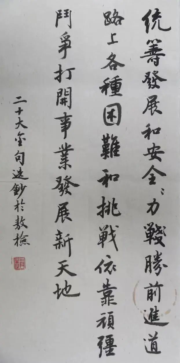 释文:统筹发展和安全,全力战胜前进道路上各种困难和挑战,依靠顽强斗争打开事业发展新天地。