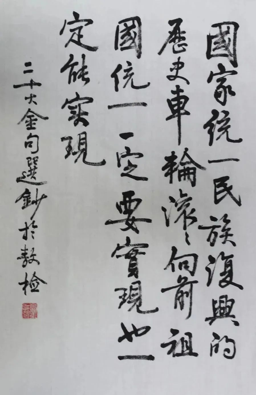 释文:国家统一民族复兴的历史车轮滚滚向前,祖国统一一定要实现,也一定能实现。