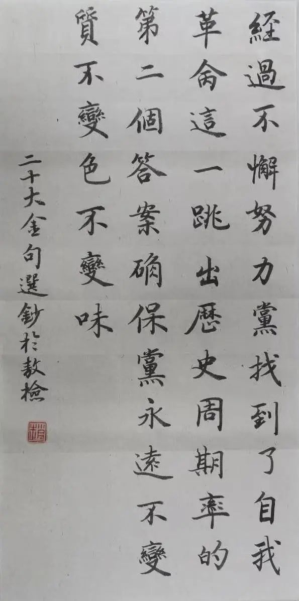 释文:经过不懈努力,党找到了自我革命这一跳出历史周期律的第二个答案,确保党永远不变质、不变色、不变味。