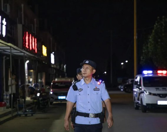 厂区通明灯火与红蓝闪烁的警灯在夜色下交相辉映,赵恒彬正带领民警辅警热火朝天地开展夏夜治安巡查宣防工作。