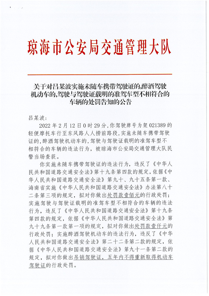 关于对吕某波实施未随车携带驾驶证的,醉酒驾驶机动车的,驾驶与驾驶证载明的准驾车型不相符合的车辆的处罚告知的公告