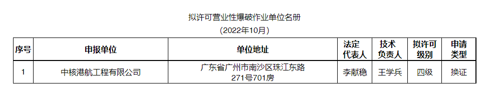 根据公安部《爆破作业单位资质条件和管理要求》(GA990-2012)相关规定和《广东省公安厅关于修订广东省公安机关爆破作业单位行政许可和管理工作实施细则(试行)的通知》(粤公规〔2020〕3号)、《关于委托各地级以上市公安机关实施营业性爆破作业单位行政许可工作的通知》(粤公网发〔2019〕1139号)相关要求,近期,广州市公安局受省公安厅委托,依法受理了中核港航工程有限公司的《爆破作业单位许可证》(营业性)到期换证申请资料。经广州市公安局审查研究,拟审批许可中核港航工程有限公司为四级营业性爆破作业单位。