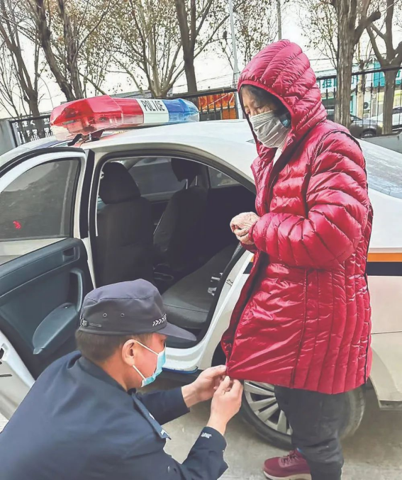 天气寒冷,辅警王永召和姜人杰用警车把杨女士和母亲送回家。在老人下车时,王永召看到老人羽绒服拉链没有拉,又蹲下身细心地给老人拉好拉链。此时已经是17时15分,距离老人走失已经过去近17个小时。