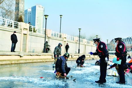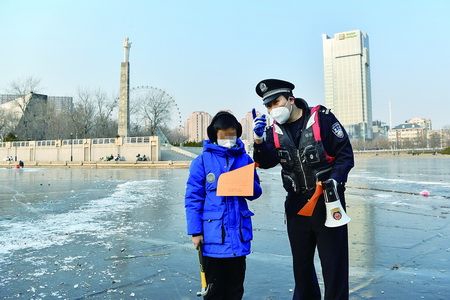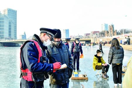 针对市民在冰面穿行、游玩、垂钓存在安全隐患的问题,日前,市公安局治安管理总队组织警力,在重点区域开展冰上安全宣传及劝阻行动。民警、辅警在海河三岔河口、狮子林桥、古文化街亲水平台等区域,现场劝阻冰上垂钓人员40余人、游玩穿行冰面群众100余人,并发放《致广大市民冬季一封信》,普及冰上安全知识,防止坠冰落水事故发生。