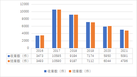 图1:2016-2021上海杨浦法院金融商事案件收、结案情况