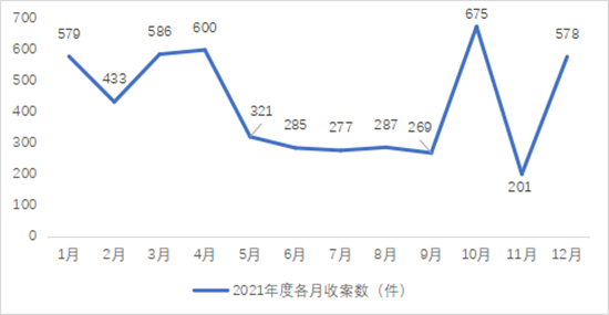 将2021年度各月的收案数进行统计,可发现2021年年初及年末的个别月份收案数较大,其原因是该期间辖区内部分银行集中催收信用卡欠款。