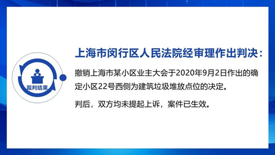 2020年9月2日,某小区业委会公示《某小区业主大会关于小区建筑垃圾池改造及河边人行步道太阳能灯安装会议决定的公告》,公告载明:通过表决,某小区业主大会依据《上海市住宅物业管理规定》第十八条作出决定:一、确定小区22号西侧为建筑垃圾堆放点位;二、同意河边人行步道太阳能灯安装。