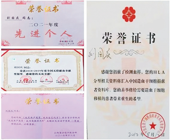 刘国庆热心社会公益事业。他是平顺县红十字会优秀志愿者,已坚持义务献血14年,共计献血20多次,他向中国造血干细胞资料库捐献了HLA抗原,随时准备为白血病患者提供重生希望。柜子里的献血证、捐献证有厚厚一大摞。