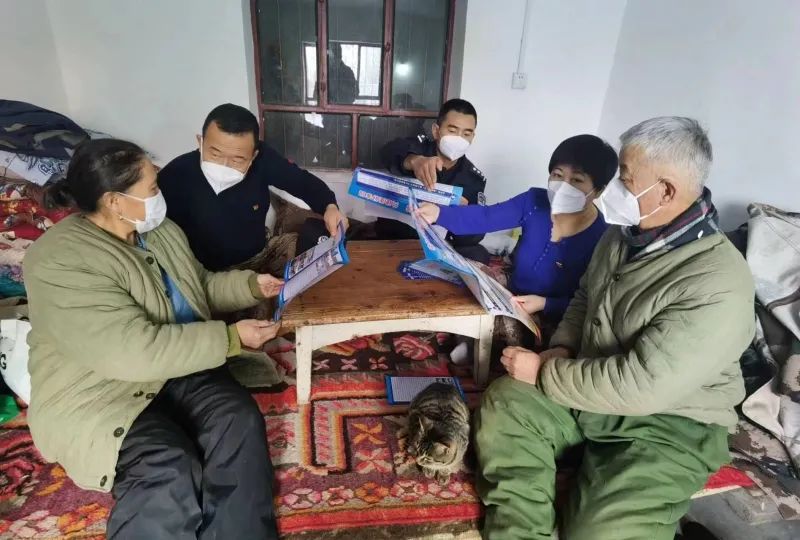 12月5日,付晓军(左二)和新疆出入境边防检查总站博州边境管理支队青得里边境派出所博尔德边境警务站站长吕博到辖区牧民家中宣传法律知识。通讯员 依力夏提·买买提沙 摄