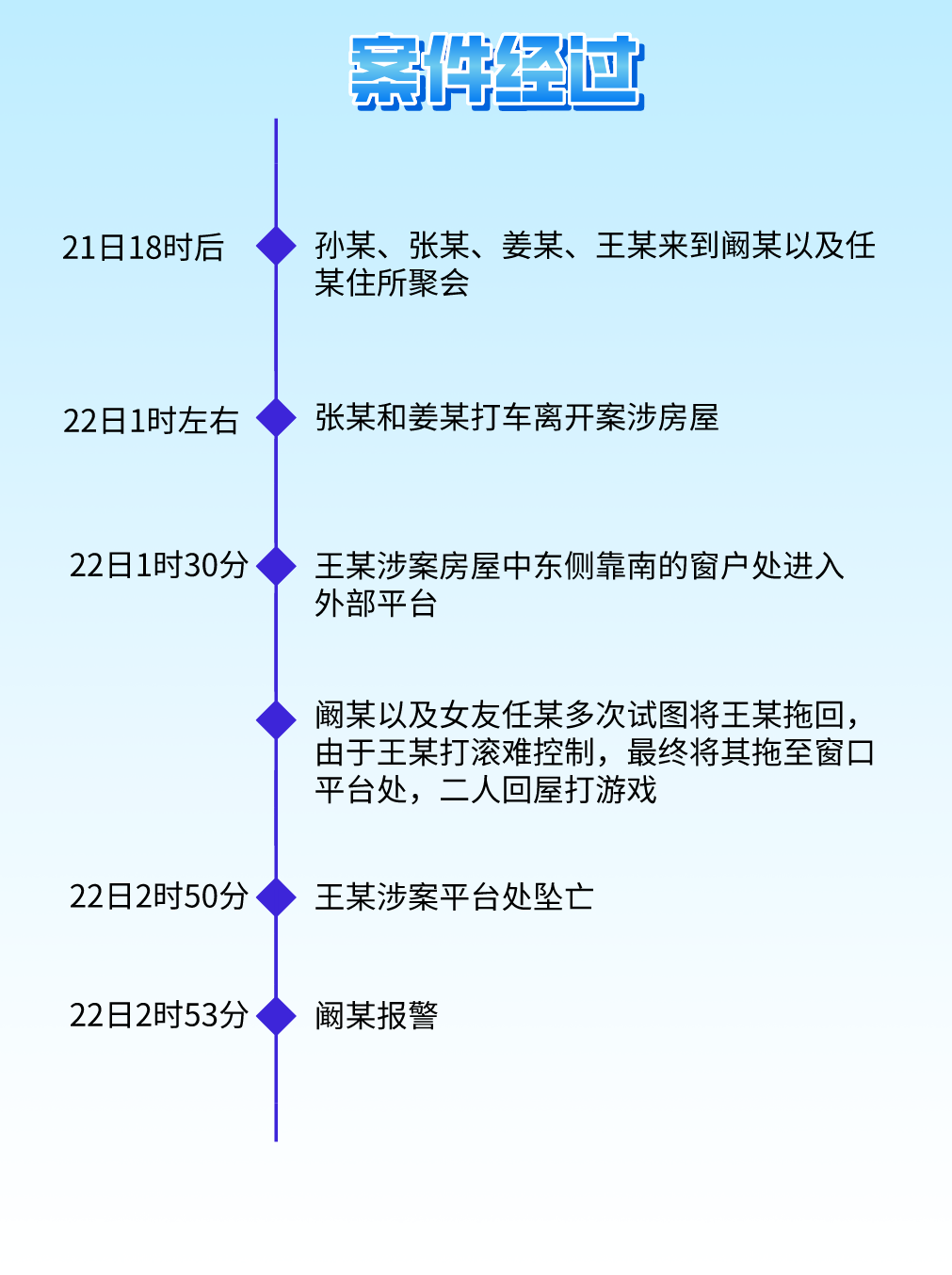 2021年6月21日下午,孙某、王某、张某等六人相约晚上聚会喝酒。当日18时后,孙某、王某、张某及其女友姜某四人陆续到阚某及其女友任某租住的某小区A座201房屋参加聚会。聚会期间,孙某、王某、张某、阚某共喝4瓶白酒,姜某、任某各自喝了几瓶啤酒。次日0时左右,聚会结束。1时左右,张某及其女友姜某打车离开案涉房屋。1时30分左右,王某从案涉房屋中东侧靠南的窗户处进入外部平台。阚某、任某见状,尝试将王某拉回屋内未果,便返回屋内打游戏。2时50分左右,王某从案涉平台处坠亡。