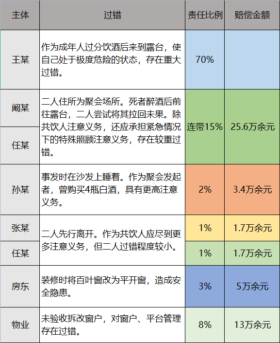 本案因涉及多方过错,法官在详细分析各方主观过错及违法行为的情况下,综合过错程度、违法行为及各方对王某酒后坠亡这一损害后果的原因力大小等因素酌定赔偿比例及金额,依法作出判决,赔偿王某父母部分合理合法损失,最终各方均未提出上诉。