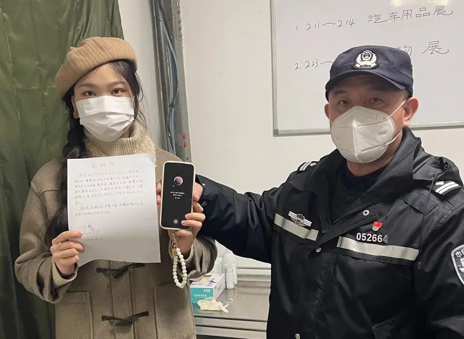 随后失主来到警务室,民警核实身份后将手机交还给失主。失主看到失而复得的手机,激动万分,当场写下感谢信。