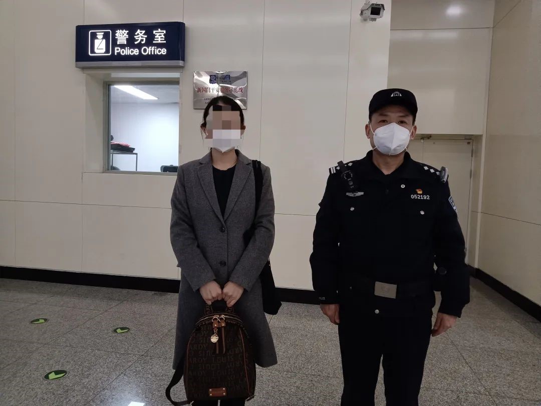 接到求助后,民警赵一鑫引导于女士回想文件丢失的细节情形,根据线索查看监控录像到站内寻找。
