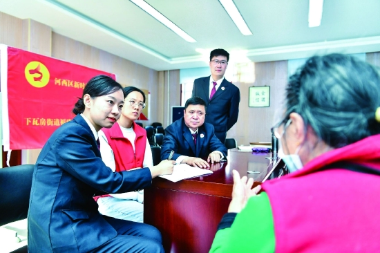 河西区检察院干警走进河西区下瓦房街道福建路社区,结合“三八”妇女节,以“守护家 守护她”为主题举办“普法关爱进社区”活动。检察官根据前期调研情况,围绕预防家庭暴力、防范电信网络诈骗等方面内容,结合办理的真实案例,现场开展精准普法和法律咨询,同时收集公益诉讼相关线索。图为检察官仔细听取群众提出的问题。
