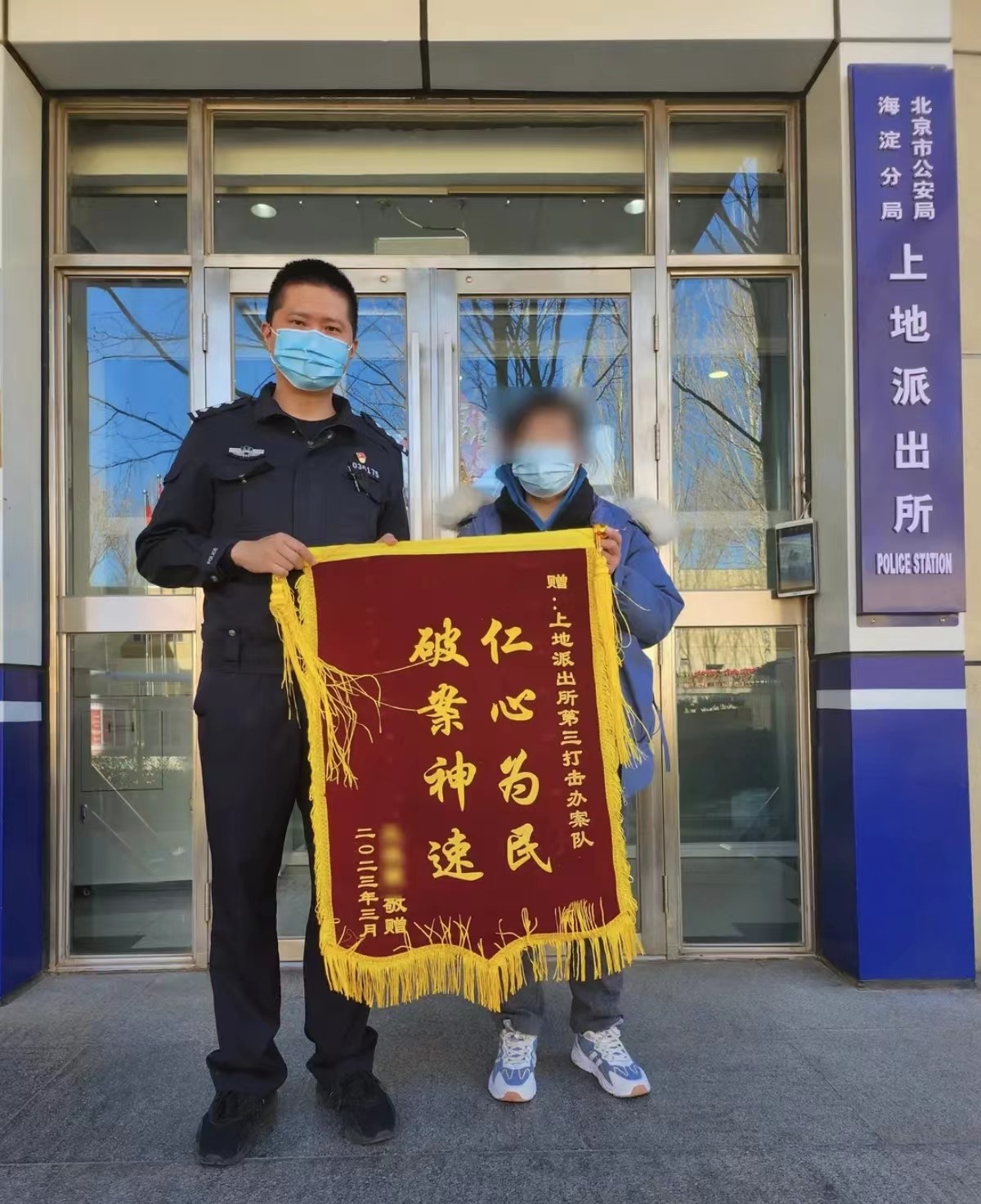 “谢谢你们,这么快就将我的电瓶找回来了……”2023年3月18日,外卖配送员王大姐来到北京市公安局海淀分局上地派出所,将一面锦旗送到民警手中,感谢民警三小时帮助她找到“丢失”的电瓶。