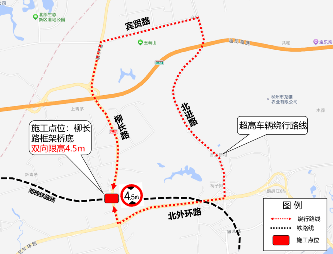 因湘桂铁路柳州枢纽扩能改造工程柳长路框架桥工程建设需要,根据《中华人民共和国道路交通安全法》第三十九条规定,定于2023年3月15日起,对柳长路铁路跨线桥底进行占道施工,施工期间车辆限高4.5m,施工工期约120天。为保证施工安全顺利进行,请超限车辆改道北外环路、北进路、宾贤路绕行,过往车辆遵照现场交通标志减速慢行,自觉服从现场交通警察、交通疏导员的指挥。施工造成的不便敬请谅解。