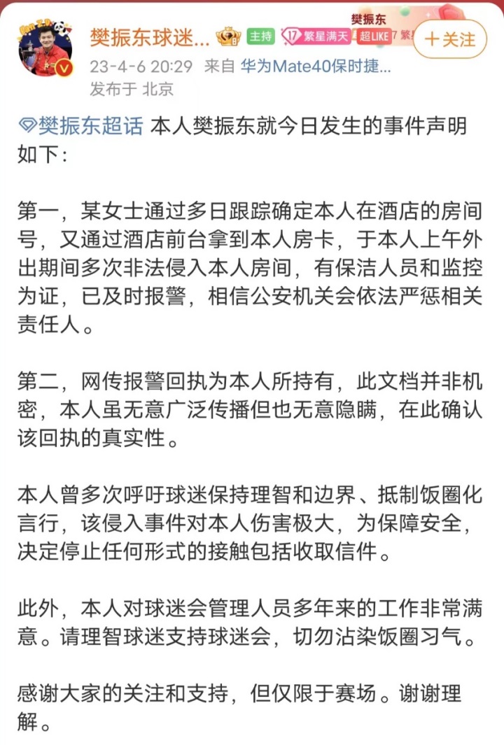 4月6日晚,樊振东通过@樊振东球迷会-天际樊星 发布声明回应房间被非法侵入一事。声明中称他本人被某女士跟踪多日确定其居住的酒店房间号并通过酒店前台拿到房卡,自己的房间在外出期间多次被非法侵入,有保洁人员和监控为证,已及时报警,并呼吁球迷切勿沾染饭圈习气。