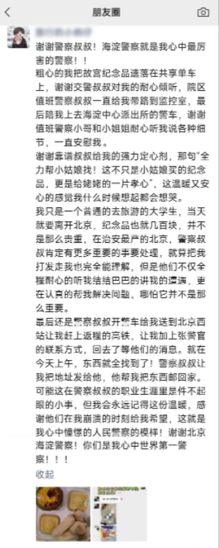 近日,北京海淀警方帮助一位来京游客找回遗失的纪念品,游客专门发朋友圈表示感谢。