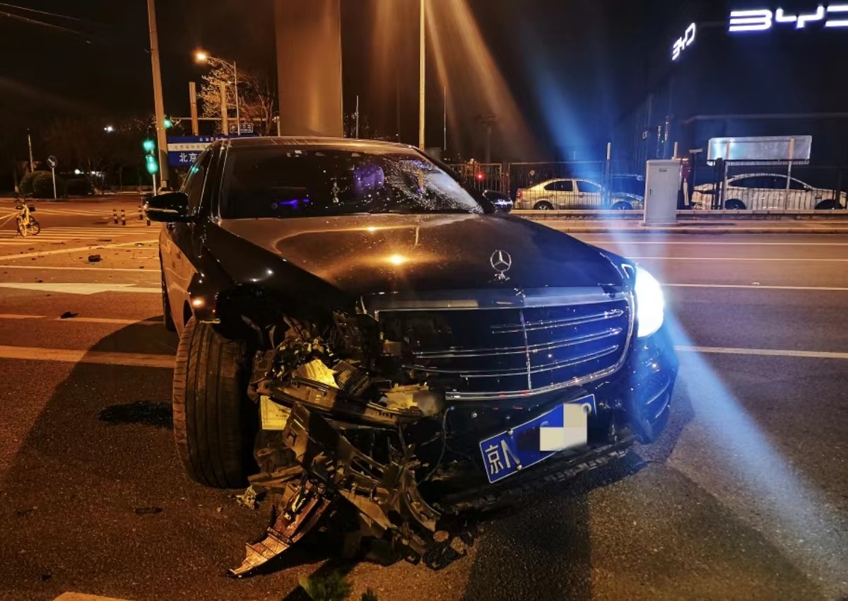听到一声巨响后,正在值班的副所长刘李根迅速赶到现场查看,一辆黑色奔驰轿车逆行与骑共享单车的杨先生相撞后,车辆右前侧又撞上路口的隔离墩,右前风挡玻璃受损,汽车零件散落一地。