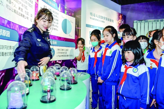 为提升青少年防毒拒毒意识、合力打造“无毒校园”,近日,西青区禁毒办组织小学生到禁毒教育基地参观学习。禁毒民警围绕当前禁毒形势、毒品种类特别是新型毒品作了详细讲解,引导同学们认清毒品危害,自觉抵御毒品诱惑。图为禁毒民警向同学们展示毒品模型。