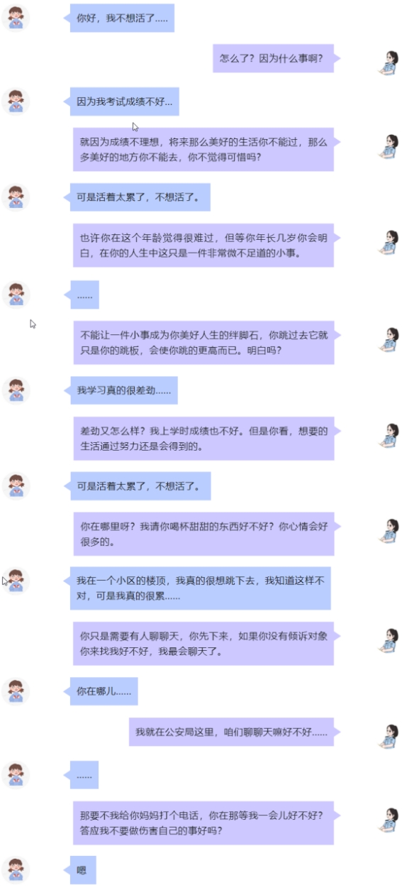 “你好,我不想活了,我想自杀……”电话那头传来一名女孩的哭诉声。4月15日18时22分,邢台市平乡县公安局110情指中心接到一起特殊警情,一名女孩因学习压力大产生了轻生念头,无人倾诉情况下,拨通了报警电话。接报后,接警员马仕青意识到警情紧急,立即上报,同时,循序渐进劝导、安抚女孩。沟通过程中得知,女孩系初中生,因为学习成绩不理想,自愧对不起父母,对生活失去希望,便产生了轻生的想法。