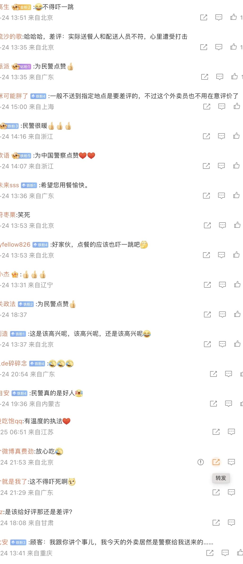 网友评论“还以为是在办案,结果是真的在送餐”。“真是给我吓一跳”。“这真是有温度的执法”。