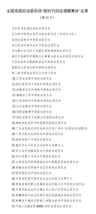 中央政法委、人力资源和社会保障部印发《关于表彰全国党委政法委系统“新时代政法楷模集体”和“新时代政法楷模个人”的决定》(以下简称《决定》),表彰33个全国党委政法委系统“新时代政法楷模集体”,10名全国党委政法委系统“新时代政法楷模个人”。