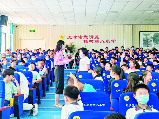 近日,武清区司法局深入杨村第八小学,为同学们开展了一场以“预防校园欺凌 ‘典’护成长”为主题的法治讲座。图为普法讲师张雨晴就民法典相关知识回答学生的提问。