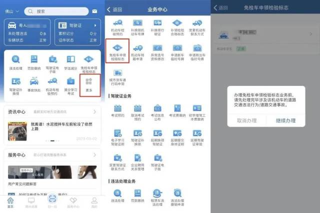 ❶登录“交管12123”APP,点击更多进入【业务中心】,选择【免检车申领检验标志】,进入申领流程。