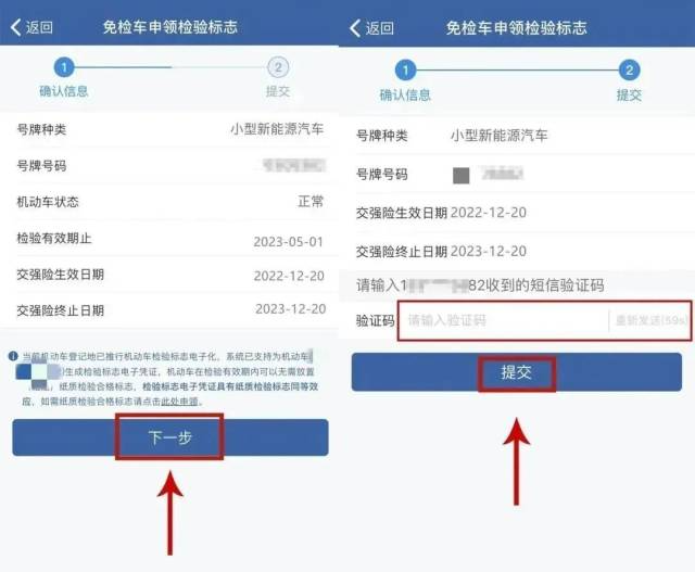 ❷核实车辆信息,确认无误后点击【下一步】,获取验证码,输入验证码并提交申请,即可获得检验标志电子凭证