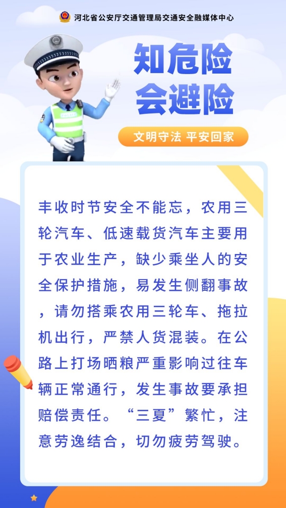 按照省委、省政府“三夏”生产总体部署,为切实做好“三夏”生产安全保障工作,河北省公安厅制定了《全省公安机关“三夏”生产安全保障工作方案》,省公安厅交通管理局公布202个服务“三夏”热线电话,对“三夏”机收车辆通行受阻等问题接诉即办、快速处置。
