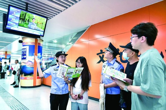 连日来,市戒毒局梅江戒毒所联合天津市全民阅读活动办公室、天津轨道交通集团组织拍摄的禁毒戒毒公益短片《关注青少年群体 远离毒品危害》,在天津地铁部分线路站区、车厢内滚动播放,增强市民识毒、防毒、拒毒意识。图为戒毒所民警在地铁 5 号线文化中心站向乘客宣讲禁毒知识。