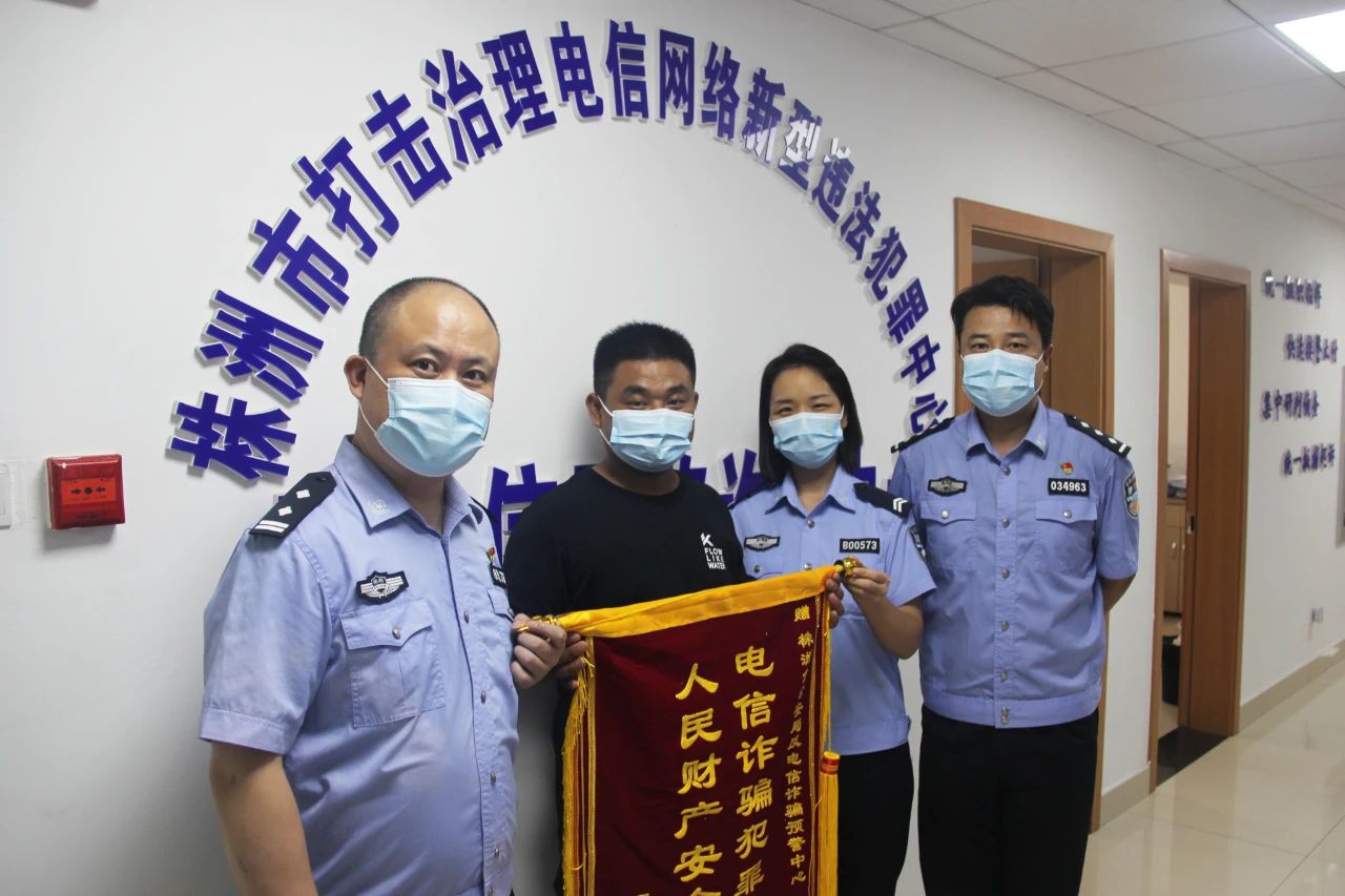 经过与诈骗分子争分夺秒的赛跑,钟刚及时在一家宾馆内找到宋女士并当面拦截劝阻。宋女士卡上的15万元安然无恙,谭先生激动地向钟刚表达谢意,并将一面“电信诈骗反诈克星、人民财产安全卫士”的锦旗送到钟刚手中。