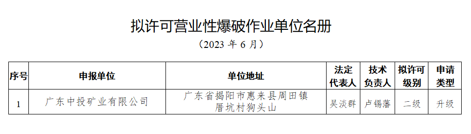 根据公安部《爆破作业单位资质条件和管理要求》(GA990-2012)相关规定和《广东省公安厅关于修订广东省公安机关爆破作业单位行政许可和管理工作实施细则(试行)的通知》(粤公规〔2020〕3号)、《关于委托各地级以上市公安机关实施营业性爆破作业单位行政许可工作的通知》(粤公网发〔2019〕1139号)相关要求,近期,汕头市公安局受省公安厅委托,依法受理了汕头市宏大爆破工程有限公司的《爆破作业单位许可证》(营业性)到期换证申请。经汕头市公安局审查研究,拟审批许可汕头市宏大爆破工程有限公司为二级营业性爆破作业单位。