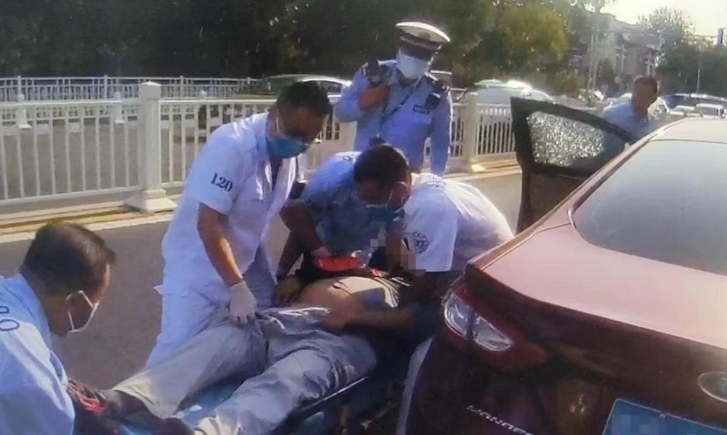 与此同时,正在附近巡逻的交警得到通报后火速赶来,不断拍打车窗呼喊司机,但司机毫无反应显然没有恢复意识。民警当机立断用破窗器击破车窗,打开车门,协助已赶来的医护人员将患者转移到救护车上,带至医院进行治疗。