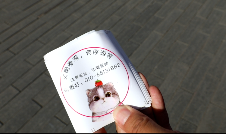 记者发现,刘培还会在巡逻中给小朋友贴上“防走失贴纸”。原来,小朋友在故宫走散的事情时有发生,家长急坏了。他和战友们就设计了印有报警电话的贴纸,一旦孩子走散,周围群众可以联系派出所。