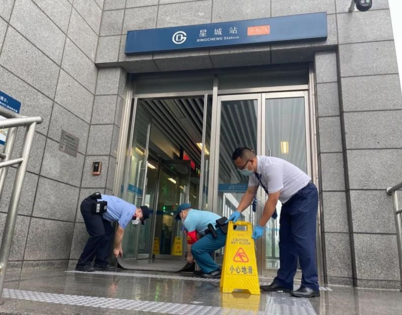 近期,北京的几场大雨正值晚高峰,为保障进出站乘客的出行安全与顺畅,公交民警迅速在站内铺设防滑垫、设立防滑牌并提醒过往乘客进出站时注意安全。