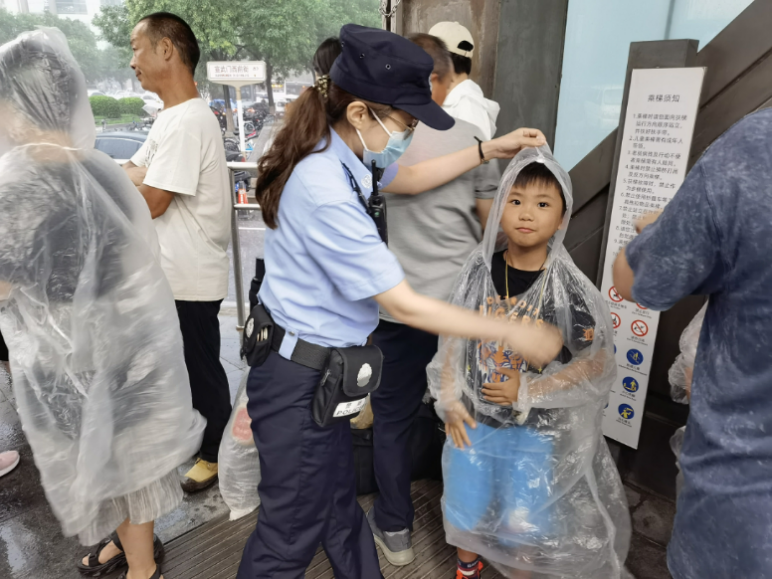 正值暑运,游客、通勤客流叠加与北京大雨的双重压力,给乘坐地铁出行的乘客带来不便,为保障乘客有序乘车,公交民警在重点车站发放雨衣、疏散客流。