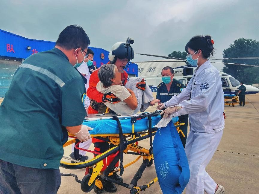 8月2日上午11时45分,一架警用直升机缓缓降落在北京警航基地内,从北京市昌平区韩台村接回的6名伤员顺利转移至旁边等候的120救护车内,第一时间送往医院救治。