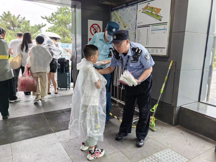7月29日午间,北京公交民警在各站开展防汛检查,组织警力在各站值守,疏导避雨的群众,为没有带伞的群众发放一次性雨衣。