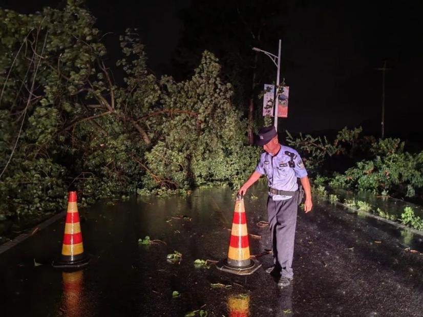 凌晨12点左右,平谷分局大华山派出所接到报警,平谷区平关路北侧道路有树木倒伏在主路上妨碍正常通行。执勤民警耿志永第一时间到达现场,发现道旁的高压线也被压断。面对现场情况,各方团结协作,耿志永一边联系应急局、供电局等部门配合,一边通过警灯和锥桶提示后方车辆避免因视线模糊和道路湿滑产生的交通隐患,同时交通支队的民警也在另一侧维护交通秩序。经过一个半小时的抢修,道路恢复了通畅。