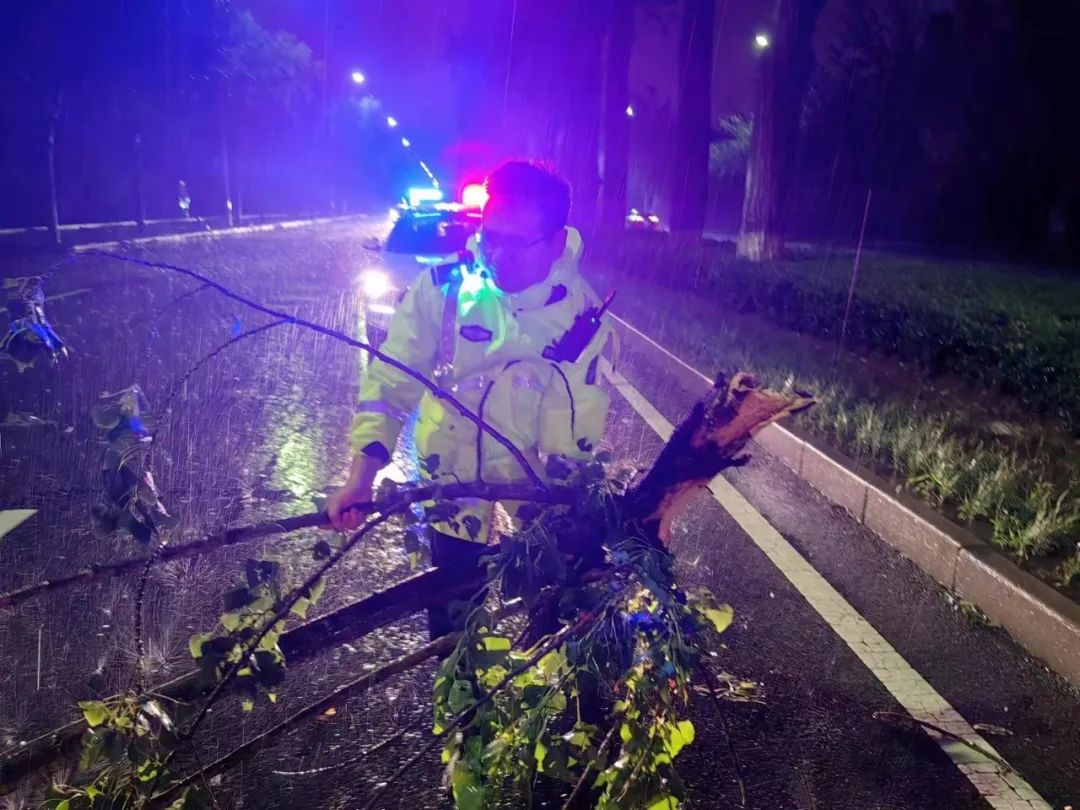 顺义分局交通支队民警李岩峰处理完工作,返程时发现暴风雨的来袭,导致多条道路两旁的树木倾倒,路面出现树木横向倒伏压占主路、极易引发交通事故。在向指挥中心上报情况后,李岩峰第一时间冒雨开展救援工作,从摆放警示标识到徒手搬移倒伏主干、清理路面枝干,他迅速排除安全隐患,保障道路的畅通。