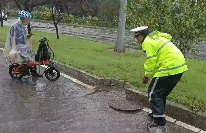 交警帮助陷入路边排水井的电动车脱困,并将井盖恢复原状