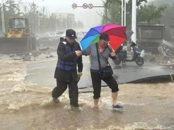 石景山分局苹果园派出所民警在遭受山洪灾害地段巡视过程中,发现有群众被困,面对塌陷积水的道路,民警和现场防汛部门一道将被困群众转移至安全地带。