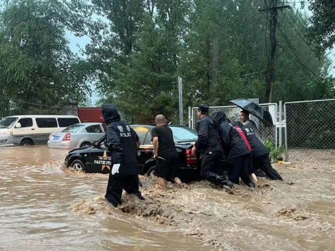 海淀分局恩济庄派出所民警在上庄镇隐患排查时,发现群众车辆涉水故障,民警立即上前,帮助车主将车辆推出主干道,确保转运路线畅通。